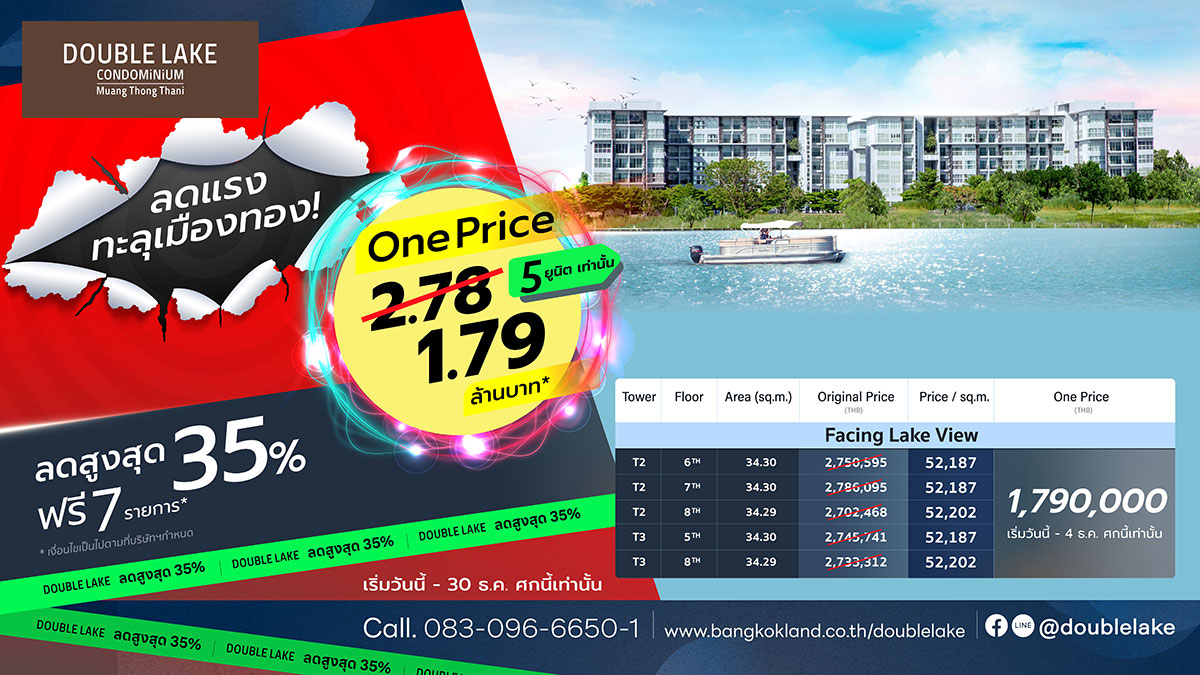Double Lake Condominium is the only 8-story low-rise condominium in Muang Thong Thani area that offers scenic lake views. In addition to high quality interior materials, the condominium is fully equipped with premium facilities including 100% parking spaces, swimming pool, fitness center, high-speed internet, cable television, 24/7 security system, CCTV cameras and key card system. Strategically located near Muang Thong Thani Expressway, Outlet Square, IMPACT Speed Park IMPACT LAKE FRONT a variety of restaurants, and entertainment complex, Double Lake Condominium is the perfect living place designed to suit the modern lifestyle, with a spacious and relaxing atmosphere together with beautiful lake views.