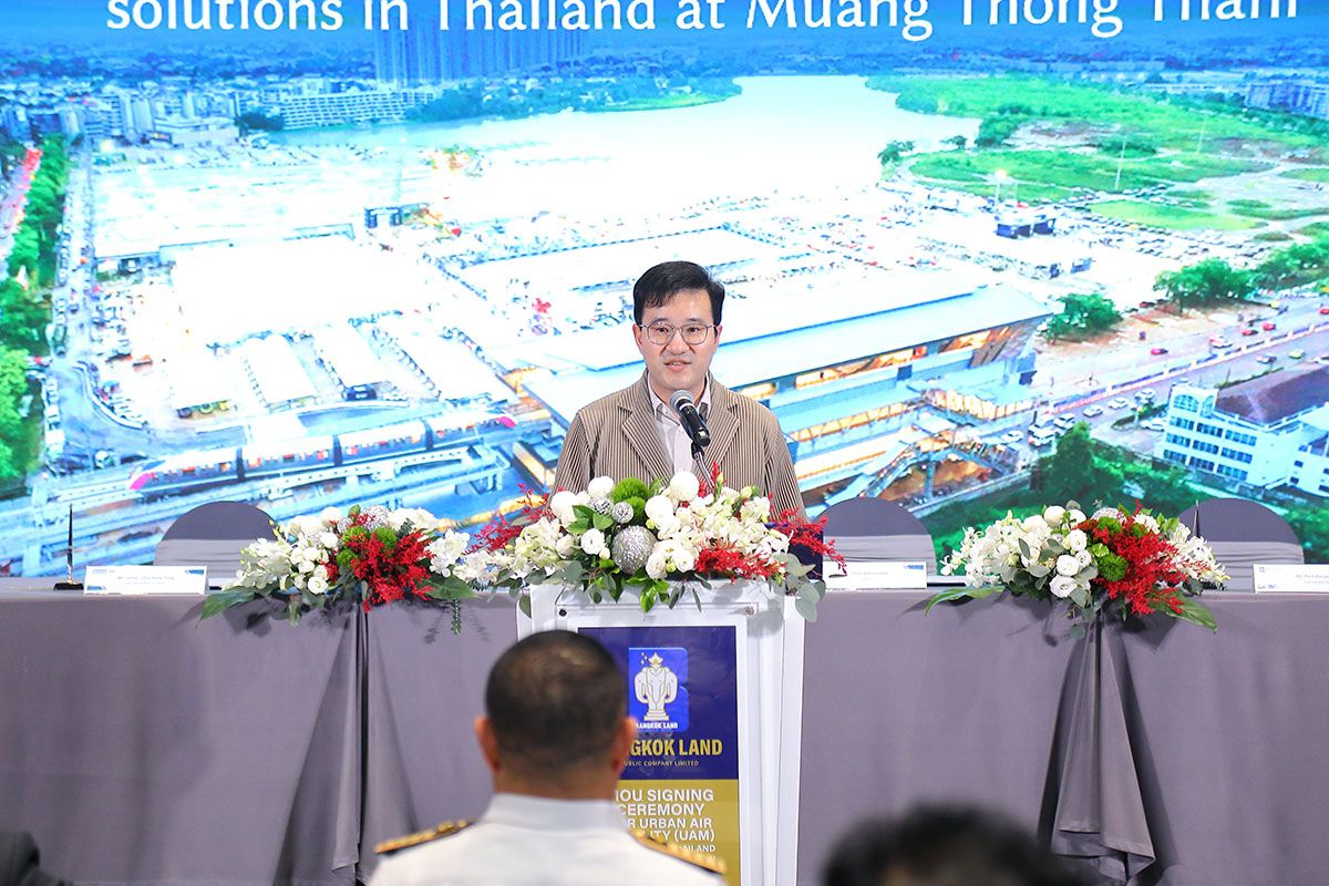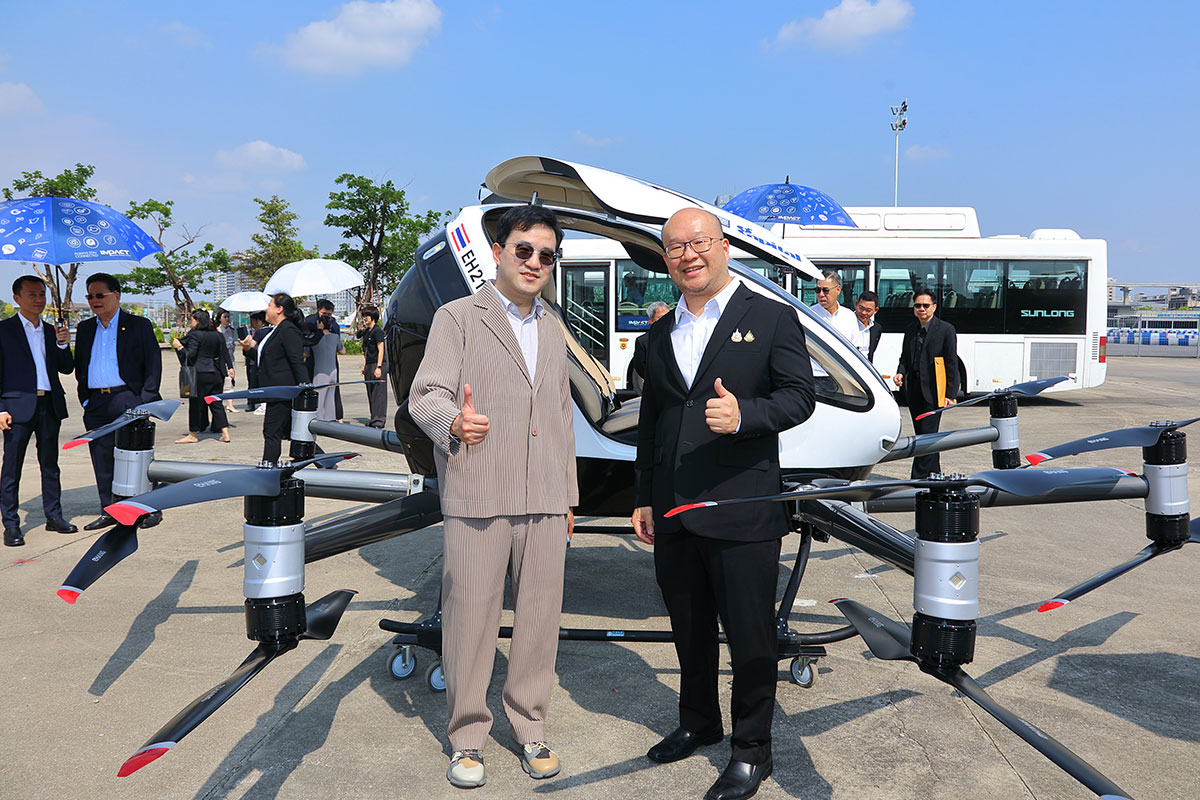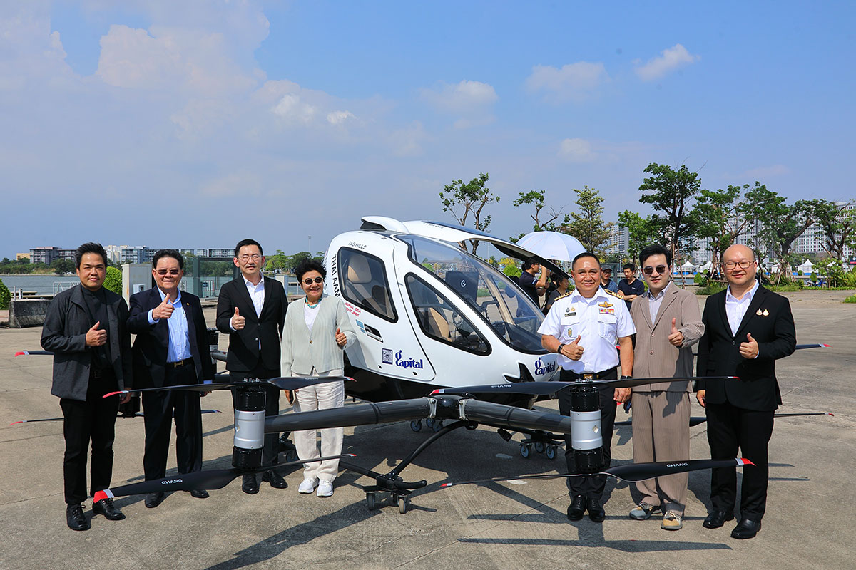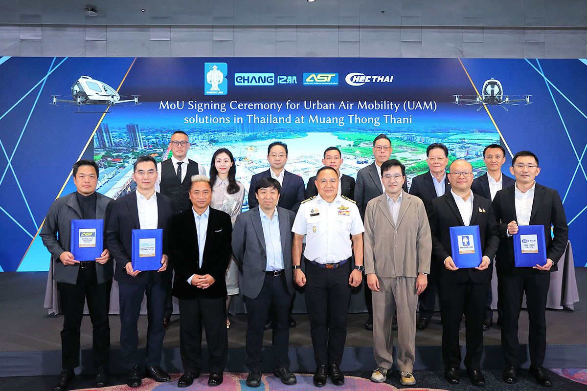 บริษัท บางกอกแลนด์ จำกัด (มหาชน) นำโดย คุณปีเตอร์ กาญจนพาสน์ (ที่ 3 จากขวา) ประธานกรรมการ และคุณพอลล์ กาญจนพาสน์ (ที่ 2 จากขวา) ประธานเจ้าหน้าที่บริหาร ร่วมกับ EHang Intelligent Equipment Co., Ltd. นำโดย มร. ฮวาจื้อ หู (ที่ 4 จากซ้าย) ผู้ก่อตั้ง ประธานกรรมการ และประธานเจ้าหน้าที่บริหาร ผู้นำระดับโลกด้านอากาศยานไฟฟ้าไร้คนขับแบบขึ้นลงทางดิ่ง (eVTOL) พร้อมด้วย บริษัท แอเรียล ซี ไทยแลนด์ จำกัด นำโดย คุณพสุ มณิปันตี (ซ้ายสุด) ประธานเจ้าหน้าที่บริหาร และ บริษัท CHEC (Thai) จำกัด นำโดย มร.ไห่กวง หวัง (ขวาสุด) กรรมการผู้จัดการ ร่วมลงนามในบันทึกความเข้าใจ (MOU) เพื่อศึกษาและพัฒนา Urban Air Mobility (UAM) หรือระบบการคมนาคมทางอากาศรูปแบบใหม่ โดยมีเมืองทองธานีเป็นพื้นที่นำร่องของประเทศไทย ณ บริเวณ ทะเลสาบ เมืองทองธานี