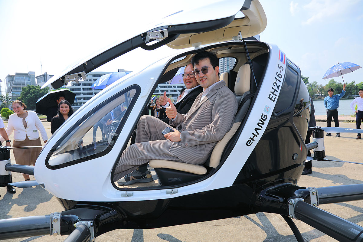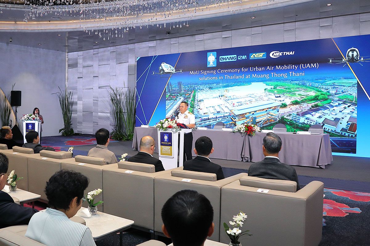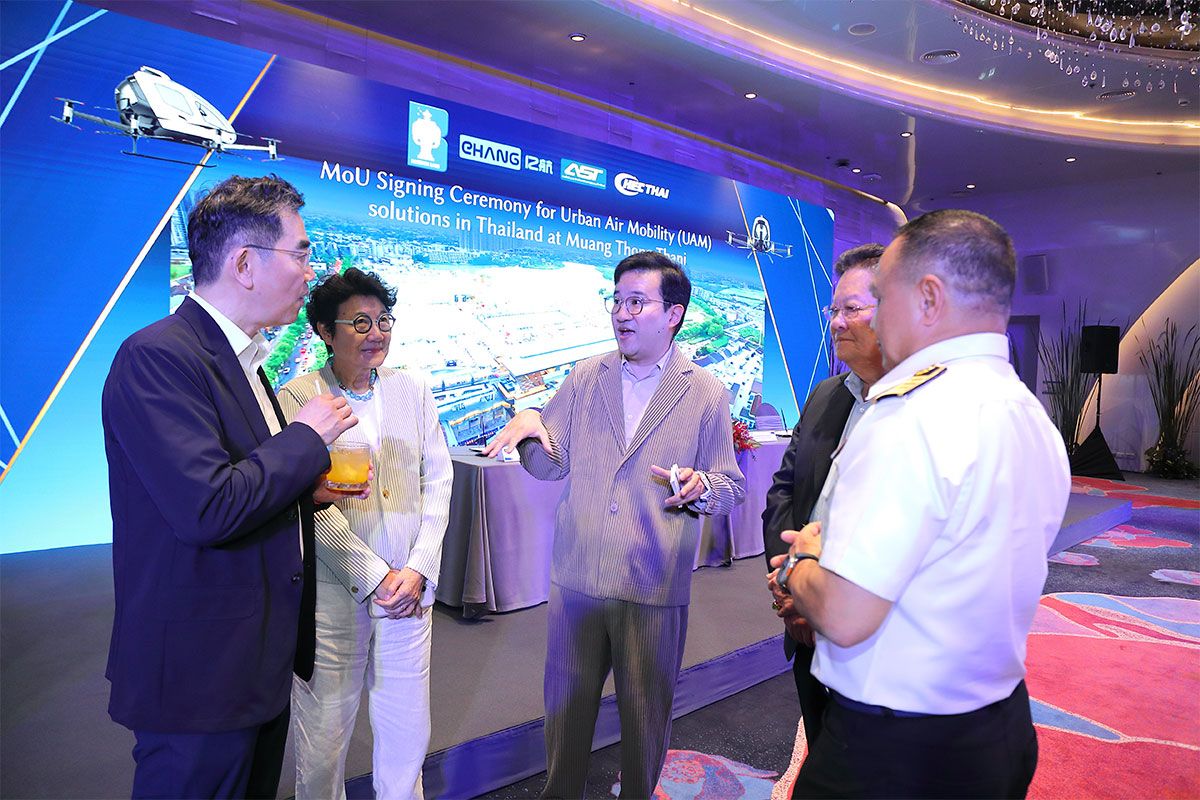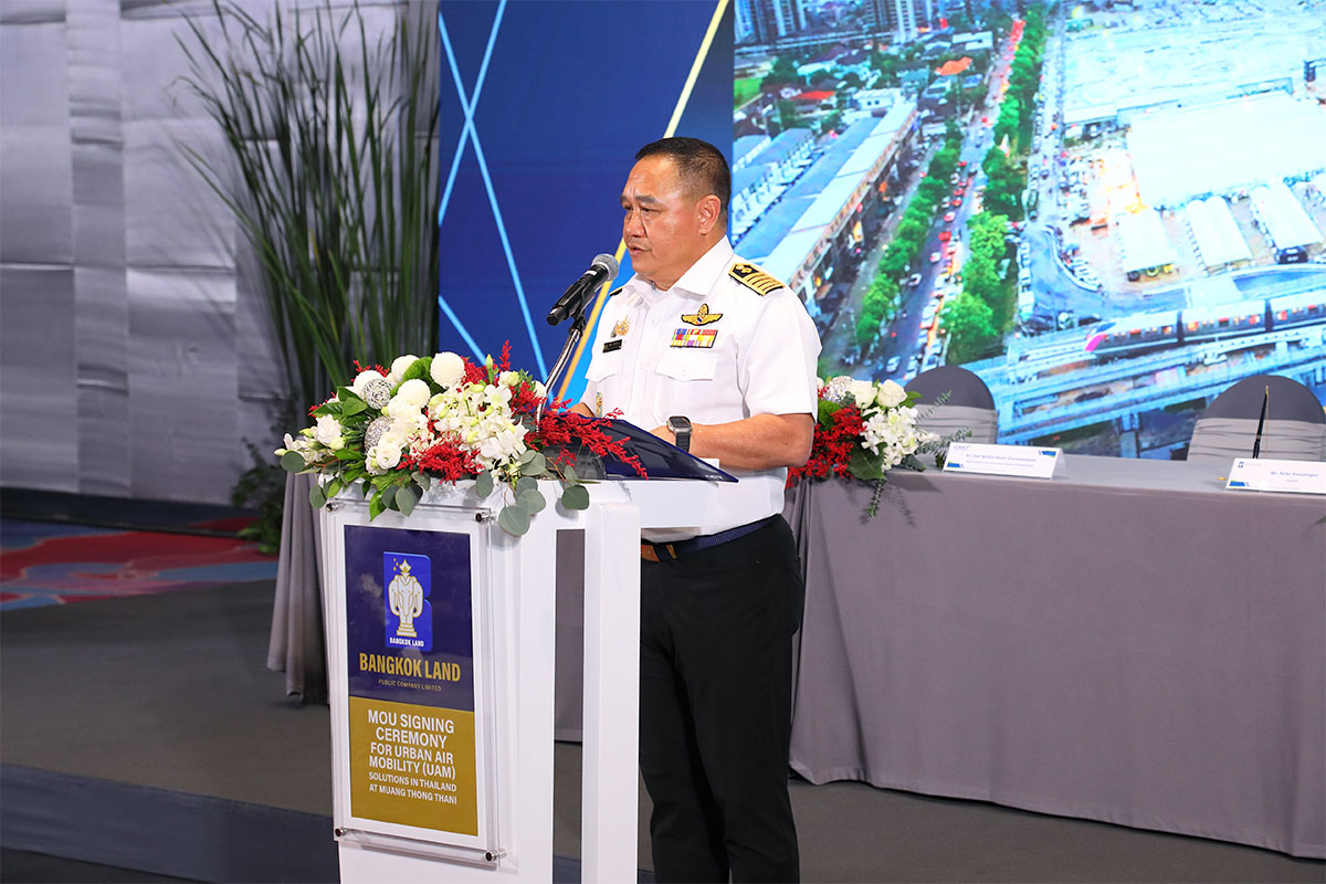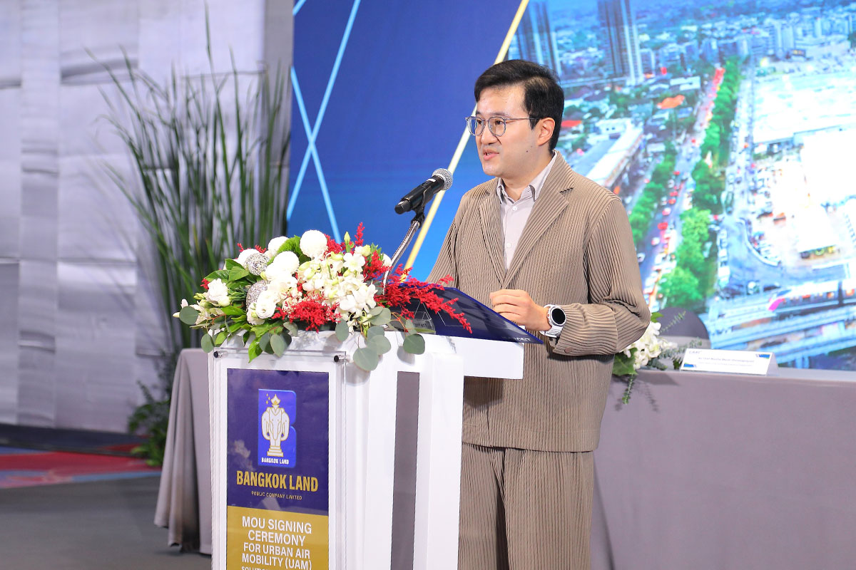 บริษัท บางกอกแลนด์ จำกัด (มหาชน) นำโดย คุณปีเตอร์ กาญจนพาสน์ (ที่ 3 จากขวา) ประธานกรรมการ และคุณพอลล์ กาญจนพาสน์ (ที่ 2 จากขวา) ประธานเจ้าหน้าที่บริหาร ร่วมกับ EHang Intelligent Equipment Co., Ltd. นำโดย มร. ฮวาจื้อ หู (ที่ 4 จากซ้าย) ผู้ก่อตั้ง ประธานกรรมการ และประธานเจ้าหน้าที่บริหาร ผู้นำระดับโลกด้านอากาศยานไฟฟ้าไร้คนขับแบบขึ้นลงทางดิ่ง (eVTOL) พร้อมด้วย บริษัท แอเรียล ซี ไทยแลนด์ จำกัด นำโดย คุณพสุ มณิปันตี (ซ้ายสุด) ประธานเจ้าหน้าที่บริหาร และ บริษัท CHEC (Thai) จำกัด นำโดย มร.ไห่กวง หวัง (ขวาสุด) กรรมการผู้จัดการ ร่วมลงนามในบันทึกความเข้าใจ (MOU) เพื่อศึกษาและพัฒนา Urban Air Mobility (UAM) หรือระบบการคมนาคมทางอากาศรูปแบบใหม่ โดยมีเมืองทองธานีเป็นพื้นที่นำร่องของประเทศไทย ณ บริเวณ ทะเลสาบ เมืองทองธานี